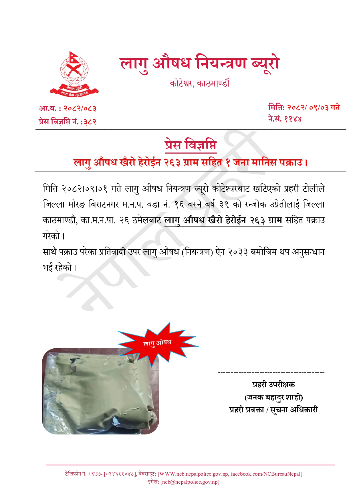 PR- 382 "लागु औषध खैरो हेरोईन २६३ ग्राम सहित मानिस पक्राउ"
